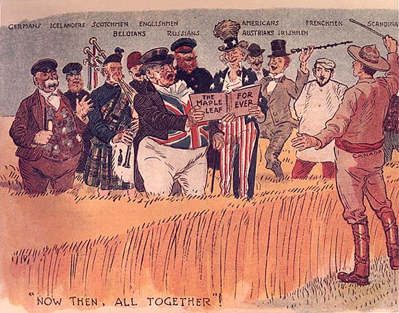 In quegli anni venne creato lo stereotipo che avrebbe dominato le immagini pubblicitarie per i successive trenta: campi di grano dorato sotto un cielo blu. I coltivatori sembravano ovviamente dei modelli da copertina: alti, gli stivali ai piedi e uno Stetson in testa, la camicia aperta sul petto. In un sondaggio d’opinione in cui si chiedeva cosa le donne pensassero del Nordovest canadese, alla domanda “si sente minacciata dagli Indiani”, la maggior parte del campione aveva risposto: “no, per niente”. Probabilmente il campione femminile si ritrovava appieno nell’identikit politicamente scorretto che dell’immigrato ideale aveva tracciato l’ineffabile Sifton: “gente robusta, col cappotto di pelle di pecora, contadini da 10 generazioni, con una moglie altrettanto robusta e una mezza dozzina di figli”.