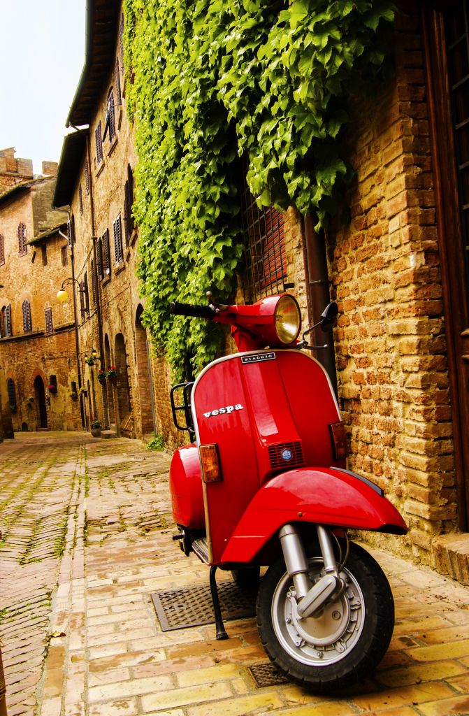 Una vespa rossa appoggiata a un muro di mattoni e’ perfetta nella brochure digitale con cui promuovo il pacchetto gold (senza che peraltro ci sia un pacchetto silver o bronze): duemila parole in 10 lezioni, incluse due sessioni “hands on” per imparare a fare il risotto alla milanese e la pizza alla napoletana. Oltre alla pratica bandana per prevenire la commistione cibo-derivati del cuoio capelluto.